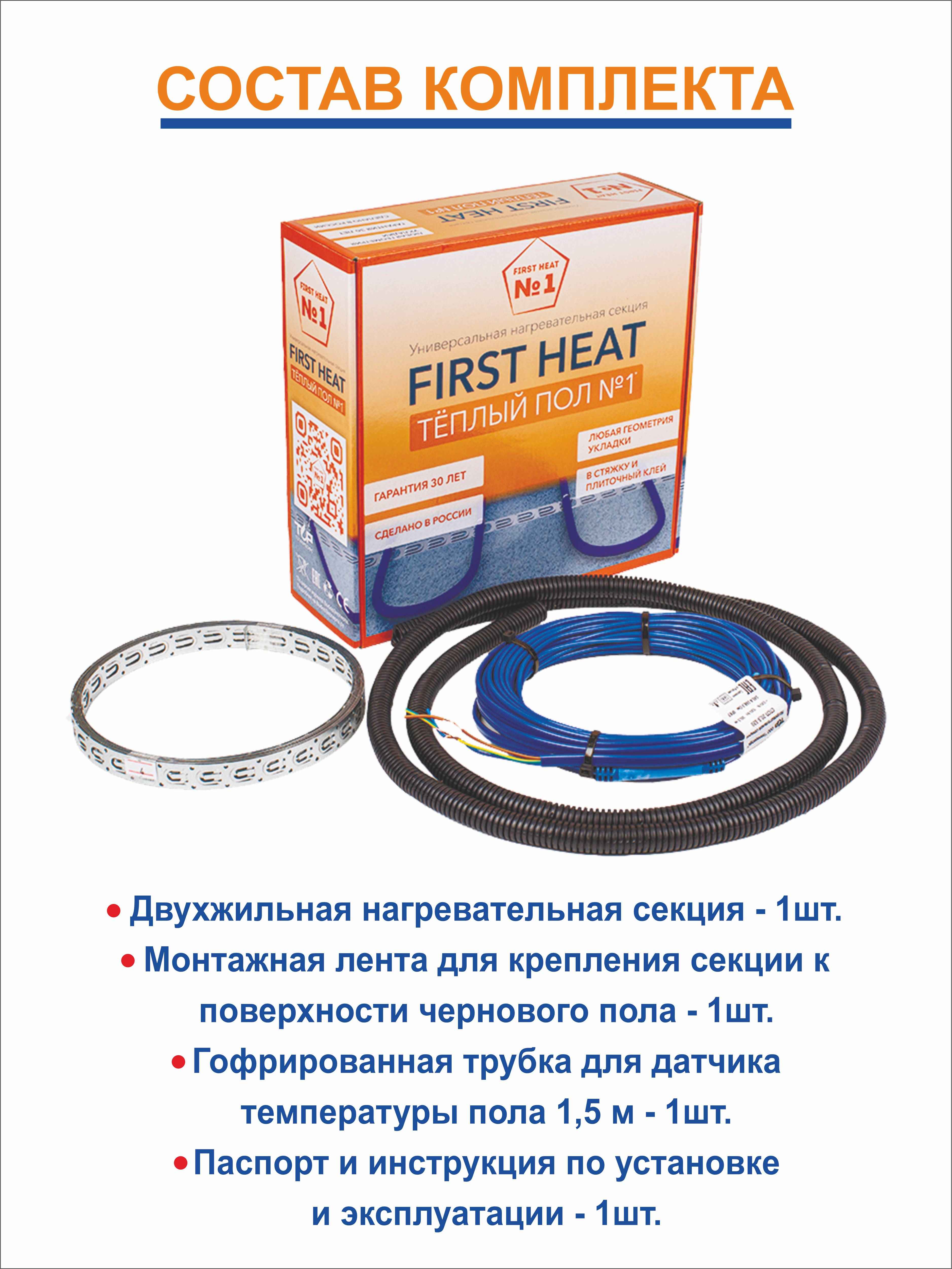 Универсальная двухжильная нагревательная секция «First Heat» (СТСП) предназначена для обеспечения комфортной температуры поверхности пола в качестве единственного источника тепла или дополнительного отопления. Установка нагревательной секции возможна под плитку (или другое декоративное покрытие) и в стяжку. Мощность секции 1120 Вт., длина кабеля 63,0 м., обогреваемая площадь 5,6-7 м.кв.